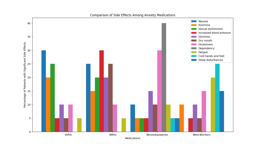 Below is a graphical comparison of the side effects among different anxiety medications. This graph is based on research and illustrates the percentage of patients experiencing significant side effects for each medication type.